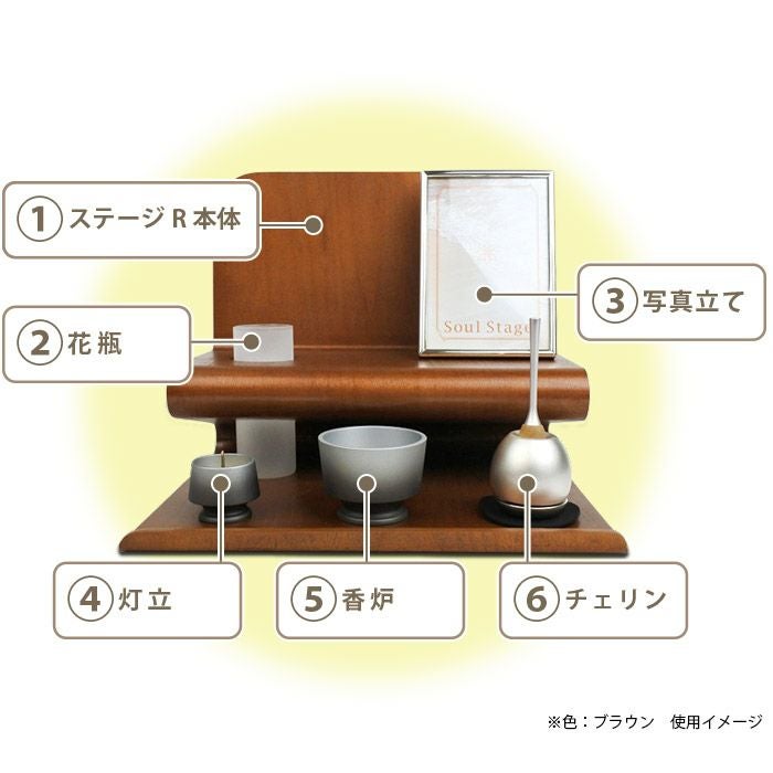 ステージ(1)に付属の花瓶(2)写真立て(3)、仏具(灯立4香炉5)、おりん(6)をセット。届いたその日からご供養頂けます。