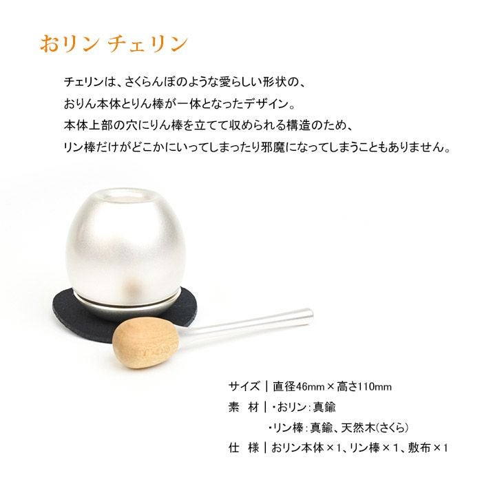 チェリンは、さくらんぼのような愛らしい形状の、おりん本体とりん棒が一体となったデザイン。