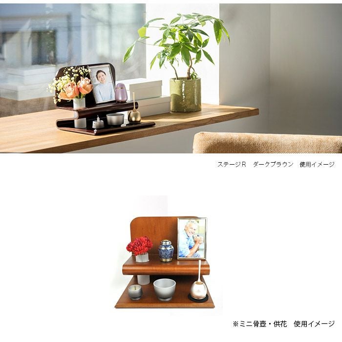 下の段に香炉や火立て、おりん、上の段に写真立てをおいても、手元供養のミニ骨壺や小さいお位牌を、メガネやアクセサリーなどの故人縁の小さな品を置けるスペースがあるなど、置き方飾り方は自由自在。