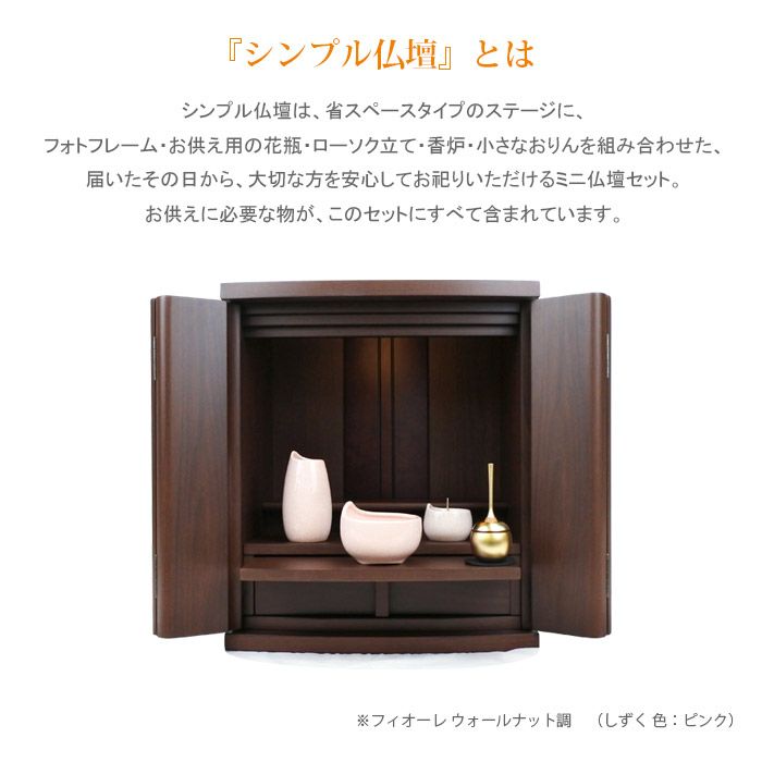 シンプル仏壇は、省スペースタイプの仏壇に、フォトフレーム・小さなおりん、色が選べるお供え用の花立(花瓶)・灯立(ローソク立て)・香炉を組み合わせた、届いたその日から、大切な方を安心してお祀りいただけるミニ仏壇セット。