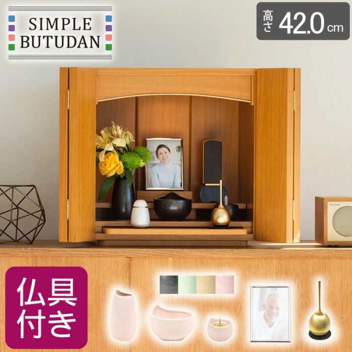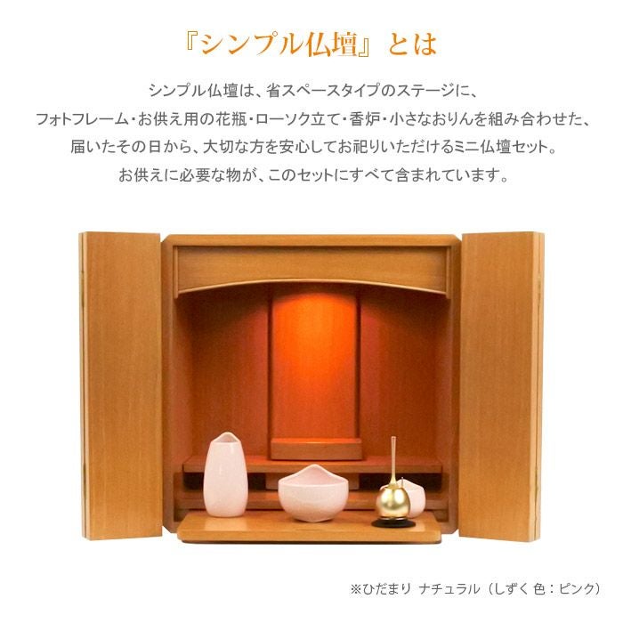 シンプル仏壇は、省スペースタイプのコンパクト仏壇に、フォトフレーム・小さなおりん、色が選べるお供え用の花立(花瓶)・灯立(ローソク立て)・香炉を組み合わせたモダンなミニ仏壇セット。