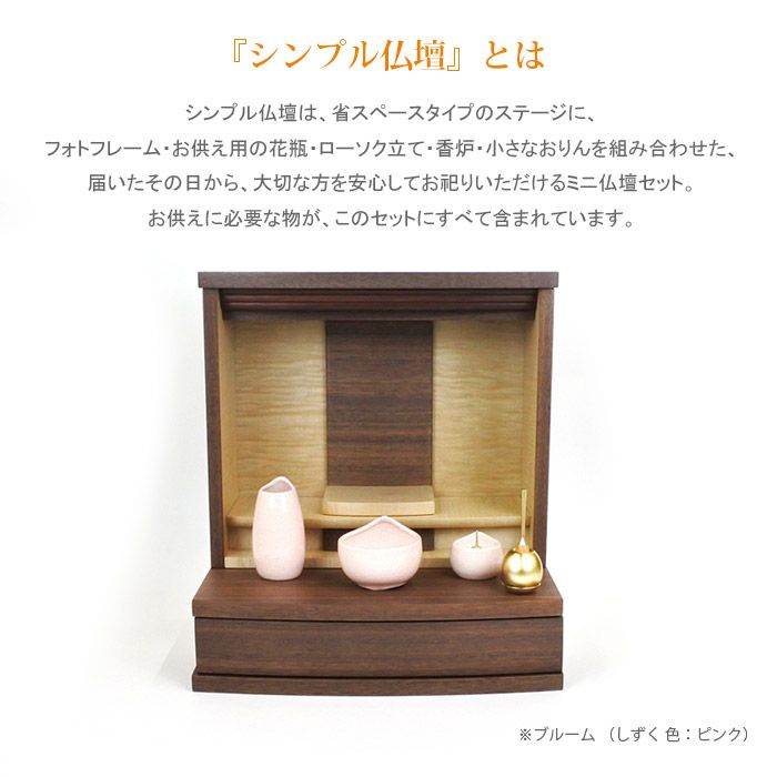 シンプル仏壇は、省スペースタイプの仏壇に、フォトフレーム・小さなおりん、色が選べるお供え用の花立(花瓶)・灯立(ローソク立て)・香炉を組み合わせた、届いたその日から、大切な方を安心してお祀りいただけるミニ仏壇セット。