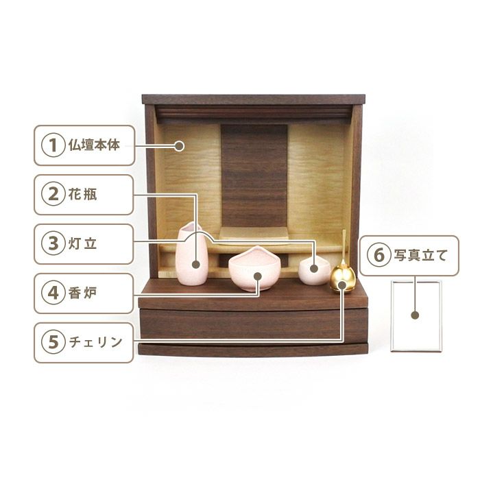 2つの色から選べる仏壇(1)に、仏具(花立(2)灯立(3)香炉(4))、おりん(5)写真立て(6)、をセット。届いたその日からご供養頂けます。