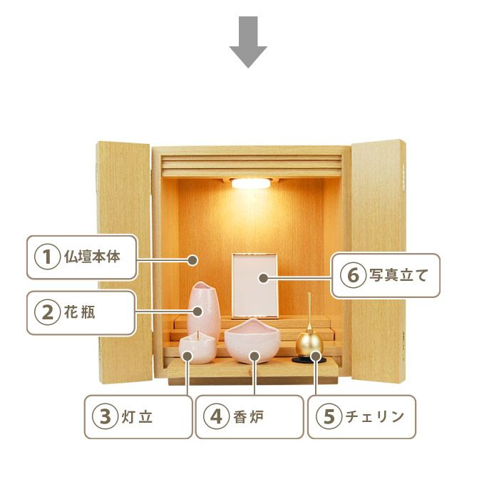 2つの色から選べる仏壇(1)に、仏具(花立(2)灯立(3)香炉(4))、おりん(5)写真立て(6)、をセット。届いたその日からご供養頂けます。