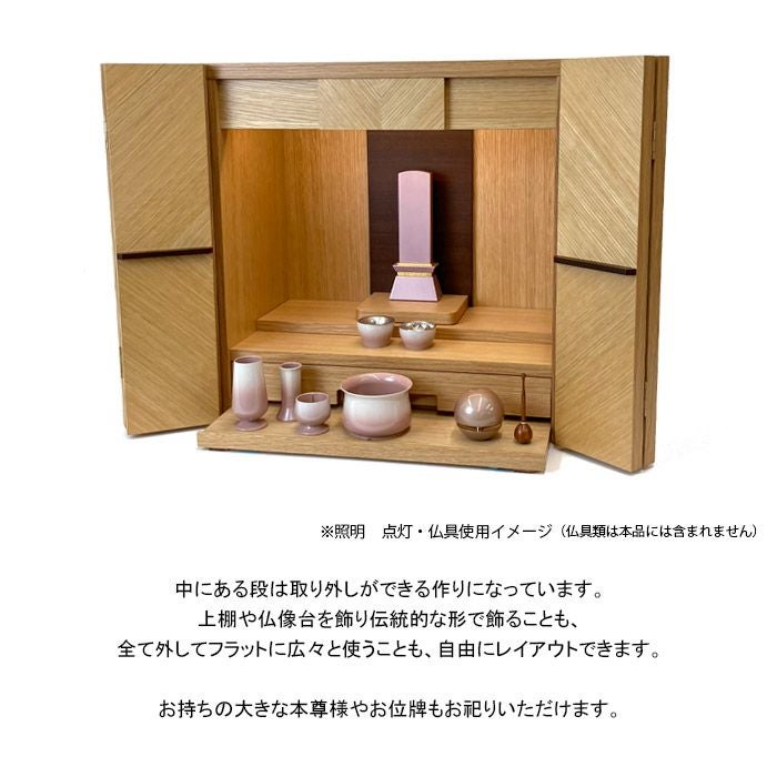 上棚や仏像台を飾り伝統的な形で飾ることも、全て外してフラットに広々と使うことも、自由にレイアウトできます。