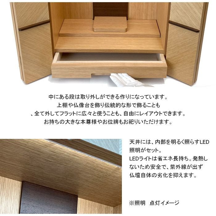 伝統的な仏壇の機能を保ちつつ、現代のライフスタイルに合わせたモダンなデザインが特徴です。