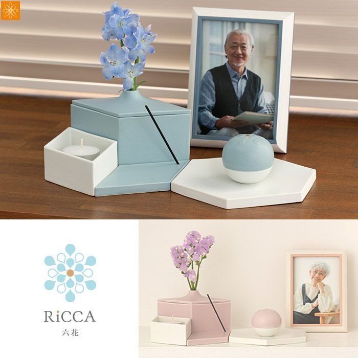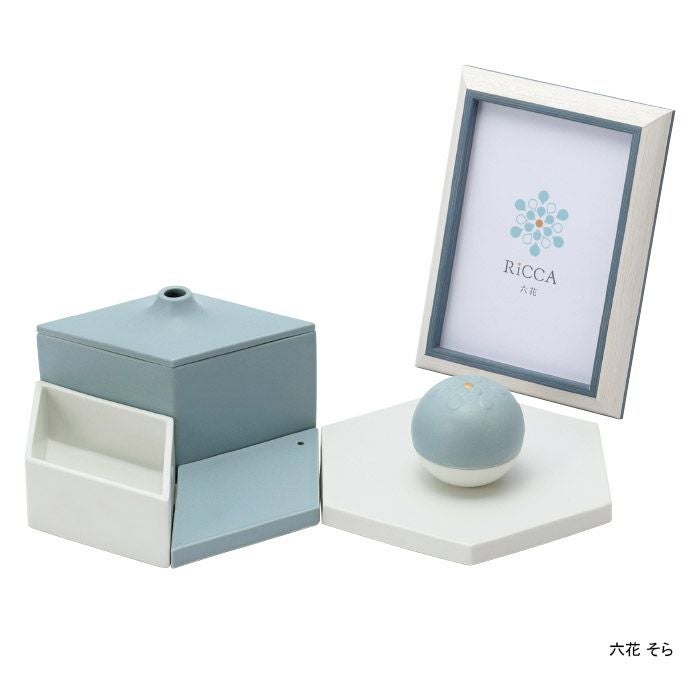 六花は、花立・灯立・香立・ステージ・プチポット・フォトフレームがそれぞれ独立している6点セットのソウル ステージ。