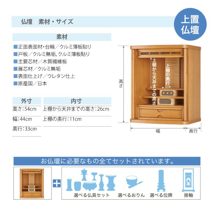 すべてのお仏壇には、仏具セット、おりん、位牌、掛軸など全てをセットしてのご提供となります。