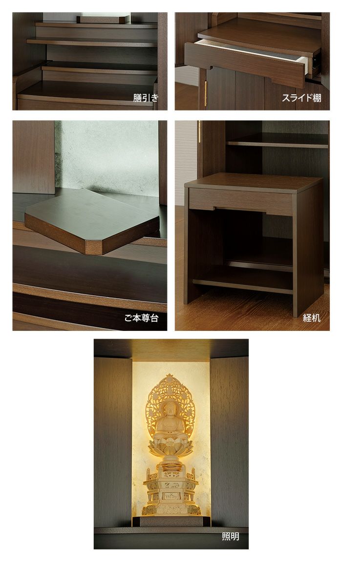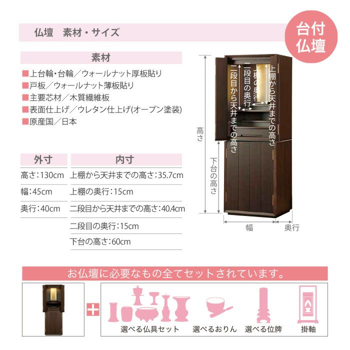 すべてのお仏壇には、仏具セット、おりん、位牌、掛軸など全てをセットしてのご提供となります。