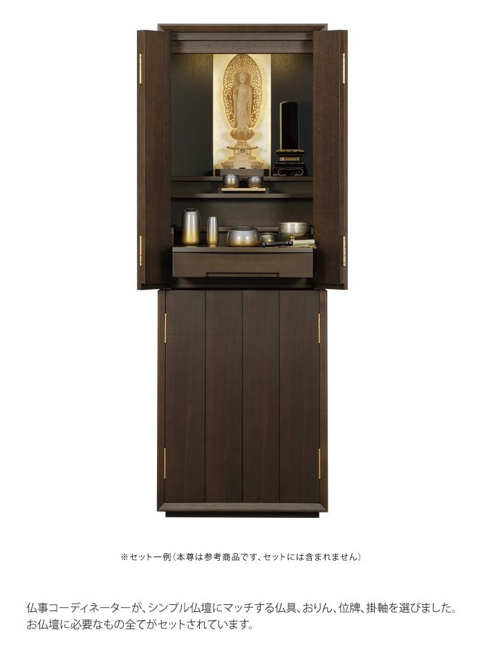 価格は、お仏壇に「仏具セット」「おりん」「位牌」「掛軸」がセットされた価格です。仏事コーディネーターが、シンプル仏壇にマッチする仏具、おりん、位牌、掛軸を選びました。お仏壇に必要なもの全てがセットされています。