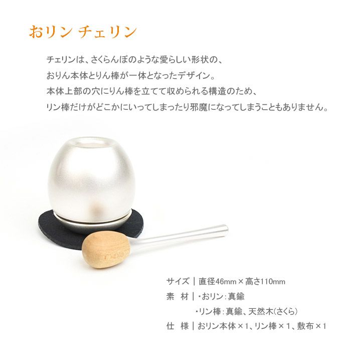 チェリンは、さくらんぼのような愛らしい形状の、おりん本体とりん棒が一体となったデザイン。