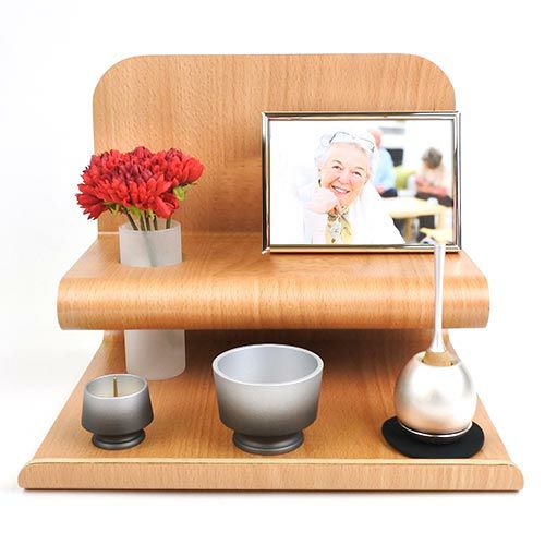 下の段に香炉や火立て、おりん、上の段に写真立てをおいても、手元供養のミニ骨壺や小さいお位牌を、メガネやアクセサリーなどの故人縁の小さな品を置けるスペースがあるなど、置き方飾り方は自由自在。