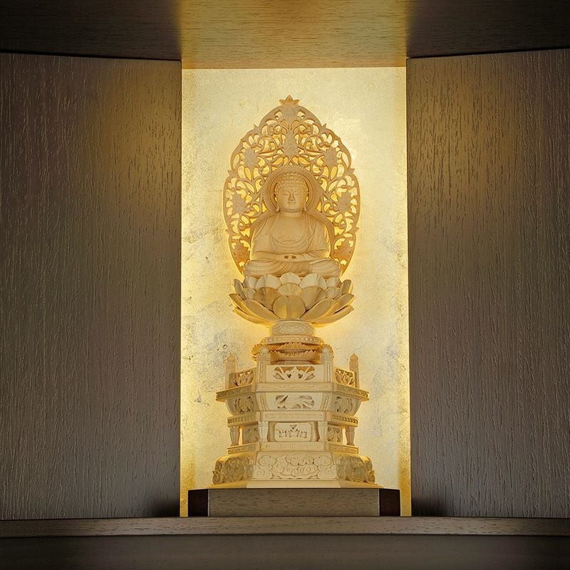 また天井の照明の他、背板には後光照明を採用。ご本尊を神々しく背後から照らし、より荘厳さを際立たせます。