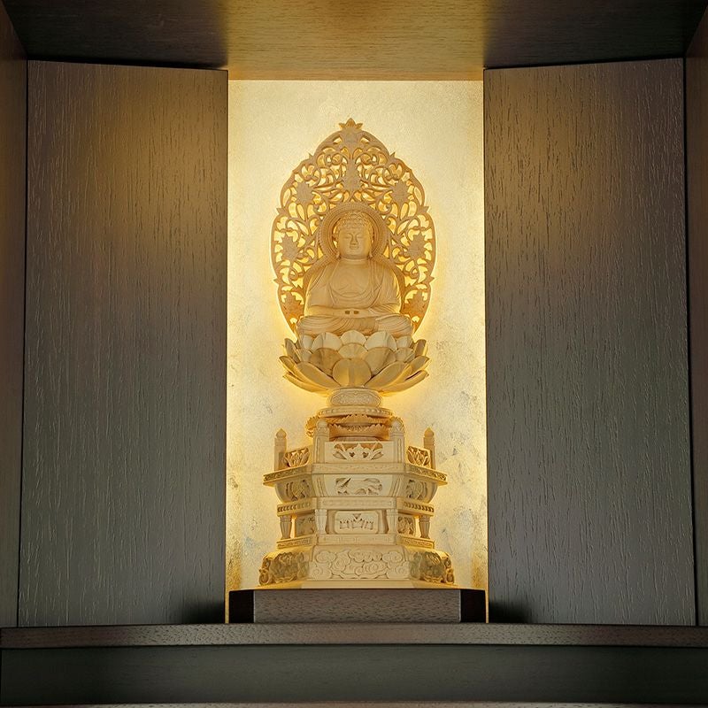 また天井の照明の他、背板には後光照明を採用。ご本尊を神々しく背後から照らし、より荘厳さを際立たせます。