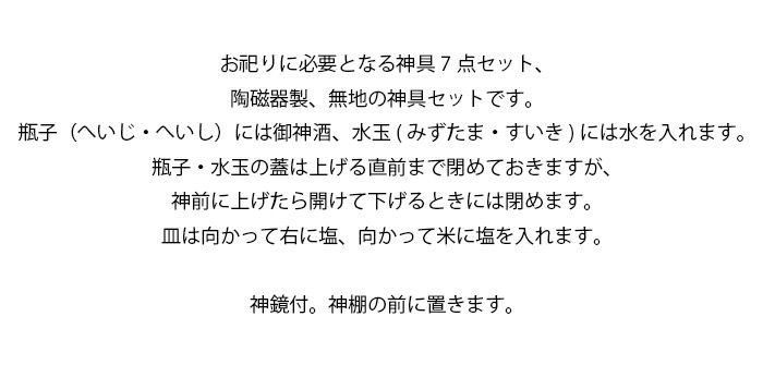 お祀りに必要となる神具7点セット、陶磁器製、無地の神具セットです。