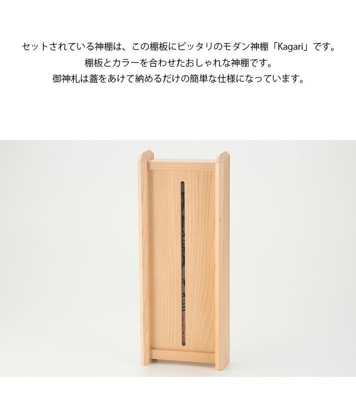 セットされている神棚は、この棚板にピッタリのモダン神棚「Kagari」です。
