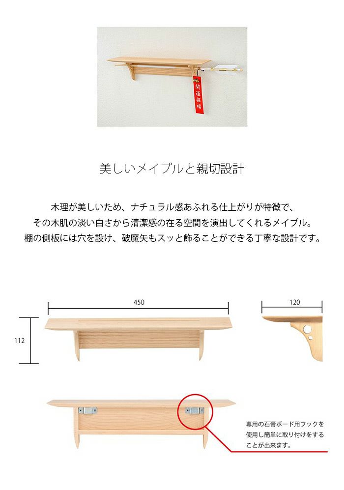 石膏ボード専用のフックと鋲を使うことで、壁への傷を最小限に抑え、石膏ボード壁にも取付が可能になりました。 今までの棚板にはない、見栄えと付けやすさ。洋風のスタイルにもしっかり溶け込むように考え抜きました。職人の技術と、北欧家具で使われる高級材・メイプル、そしてシンプルなデザインが、今までの神棚にはないリラックスした空間をつくります。