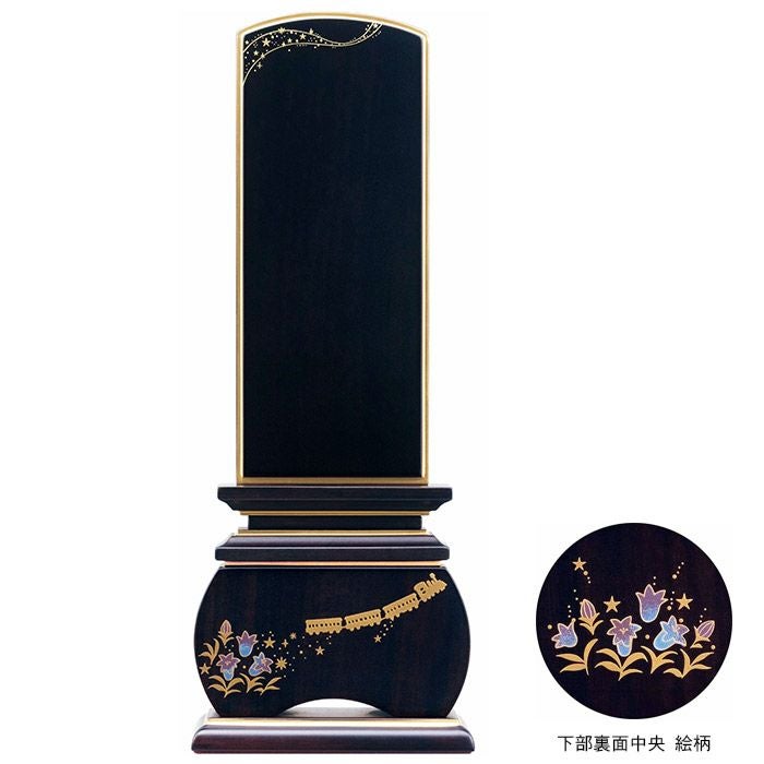 宮沢賢治の代表作「銀河鉄道の夜」をモチーフに、銀河を旅する汽笛を吹く黒色の機関車を表現した装飾を、お位牌に施しました。