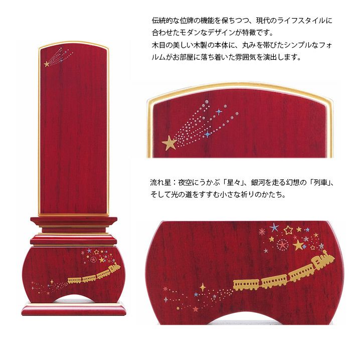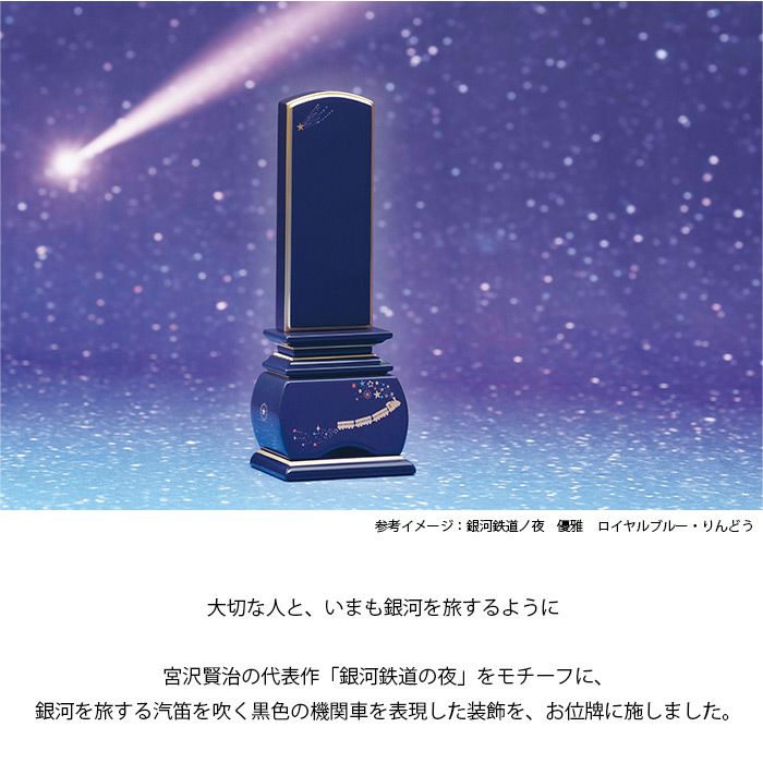 宮沢賢治の代表作「銀河鉄道の夜」をモチーフに、銀河を旅する汽笛を吹く黒色の機関車を表現した装飾を、お位牌に施しました。
