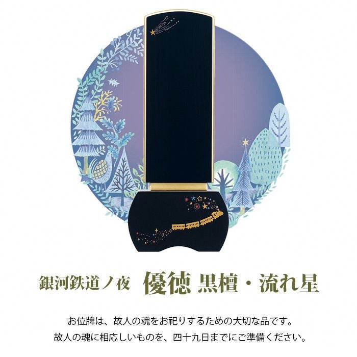 宮沢賢治の代表作「銀河鉄道の夜」をモチーフに、銀河を旅する汽笛を吹く黒色の機関車を表現した装飾を、お位牌に施しました。
