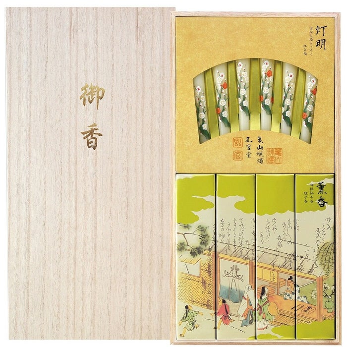 お線香の元祖「仙年香」を進物用に特別調合した「吟撰仙年香」と、希少な天然蜜蝋を配合した絵蝋燭をセットにした、ワンランク上のご進物。