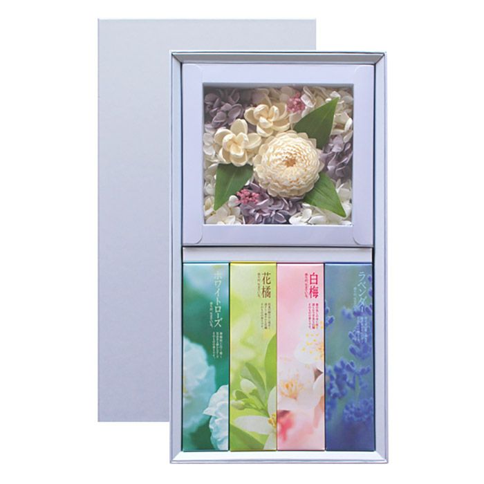 お香のように心に溶けこむ香り豊かなお線香「かたりべ」と、淡く美しい花々(アレンジメントフラワー)を詰め合わせました。