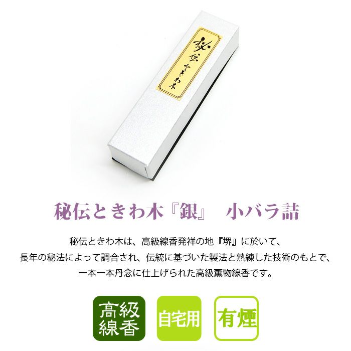 「銀判 秘伝ときわ木」は、ベトナム産シャム沈香と老山白檀を贅沢に配合し、数種の漢薬香料との配合によって、沈香と白檀の薫をより際立たせた高級品です。