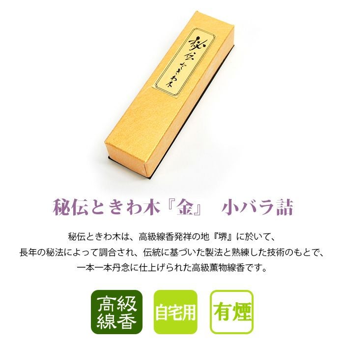 秘伝ときわ木は、高級線香発祥の地『堺』に於いて、長年の秘法によって調合され、伝統に基づいた製法と熟練した技術のもとで、一本一本丹念に仕上げられた高級薫物線香です。
