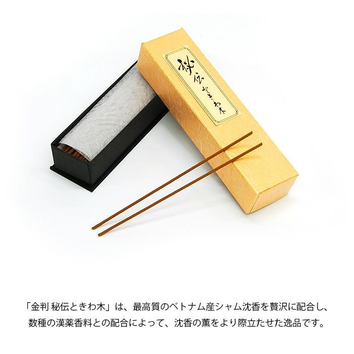 「金判 秘伝ときわ木」は、最高質のベトナム産シャム沈香を贅沢に配合し、数種の漢薬香料との配合によって、沈香の薫をより際立たせた逸品です。
