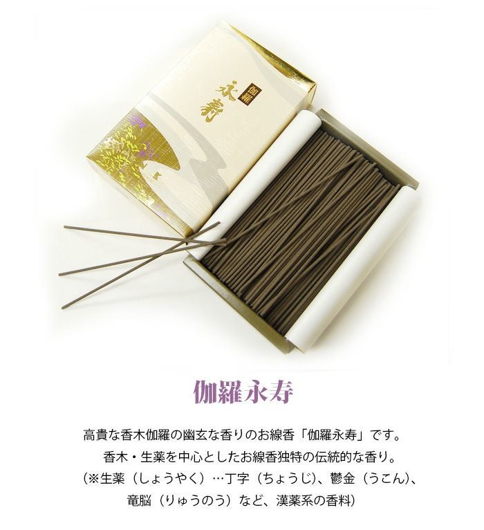 高貴な香木伽羅の幽玄な香りのお線香「伽羅永寿」です。