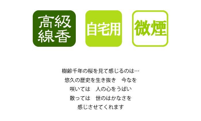 この製品は千年桜のように、長い年月、朽ち果てることなく今なを清楚にして気品ある独特の芳香を放つ香木「沈香」を主原料に配合して練り上げました。