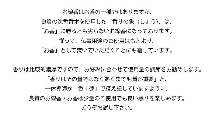 お線香はお香の一種ではありますが、良質の沈香香木を使用した『香りの象(しょう)』は、「お香」に勝るとも劣らないお線香になっております。従って、仏事用途のご使用はもとより、「お香」として焚いていただくことにも適しています。
