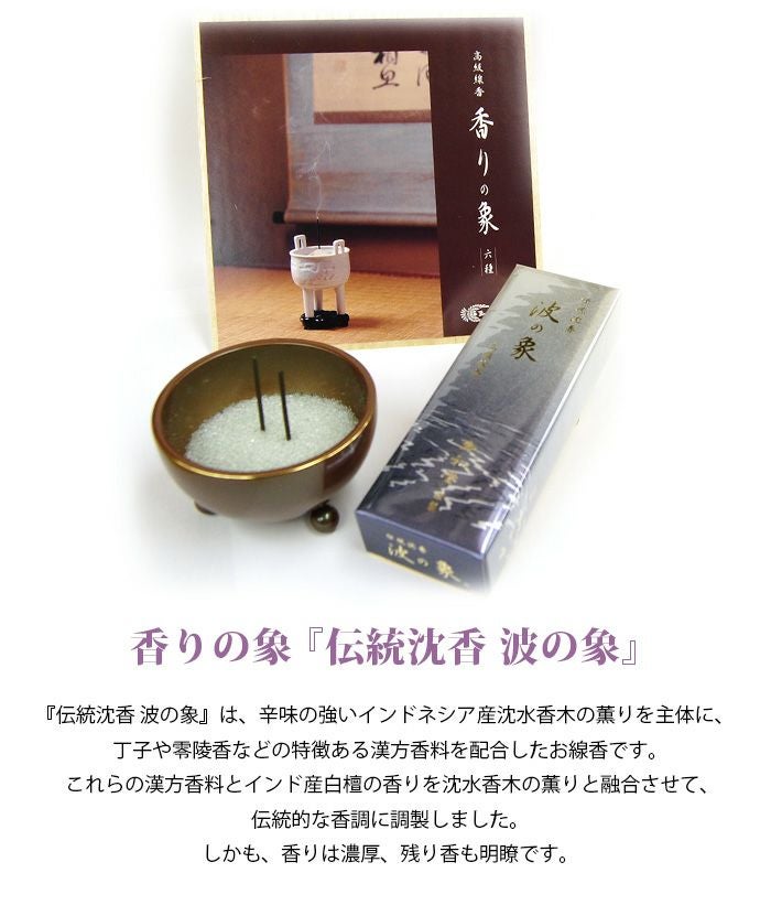 『伝統沈香 波の象』は、辛味の強いインドネシア産沈水香木の薫りを主体に、丁子や零陵香などの特徴ある漢方香料を配合したお線香です。