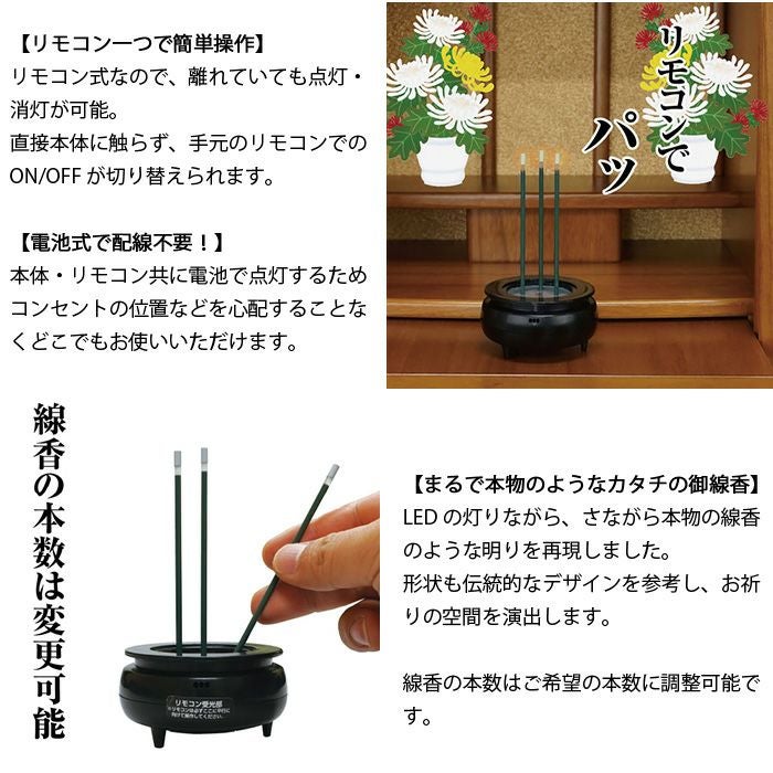 トレンドのミニ仏壇・モダン仏壇にフィットする、小さなサイズのLEDお線香。