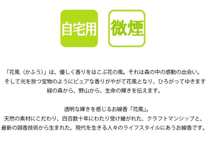 透明な輝きを感じるお線香「花風」。天然の素材にこだわり、四百数十年にわたり受け継がれた、クラフトマンシップと、最新の調香技術から生まれた、現代を生きる人々のライフスタイルにあうお線香です。