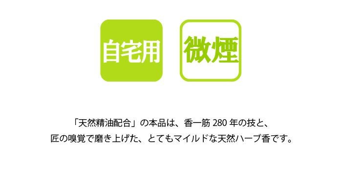 「天然精油配合」の本品は、香一筋280年の技と、匠の嗅覚で磨き上げた、とてもマイルドな天然ハーブ香です。