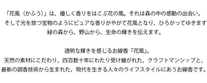透明な輝きを感じるお線香「花風」。天然の素材にこだわり、四百数十年にわたり受け継がれた、クラフトマンシップと、最新の調香技術から生まれた、現代を生きる人々のライフスタイルにあうお線香です。