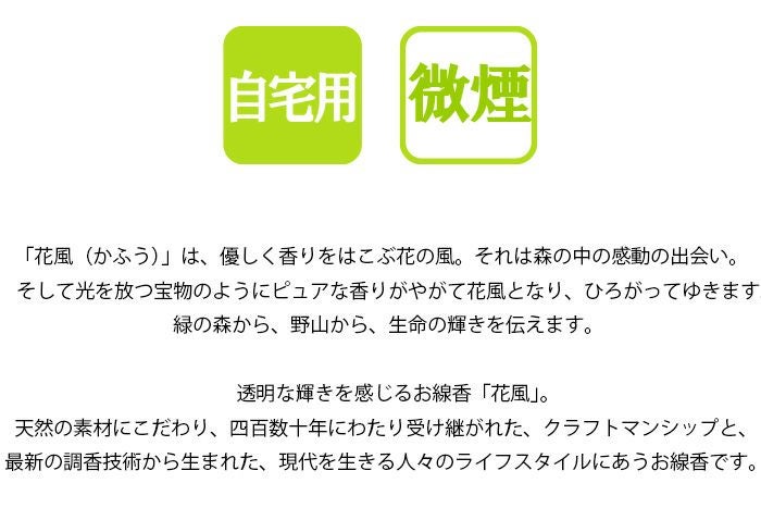 透明な輝きを感じるお線香「花風」。天然の素材にこだわり、四百数十年にわたり受け継がれた、クラフトマンシップと、最新の調香技術から生まれた、現代を生きる人々のライフスタイルにあうお線香です。