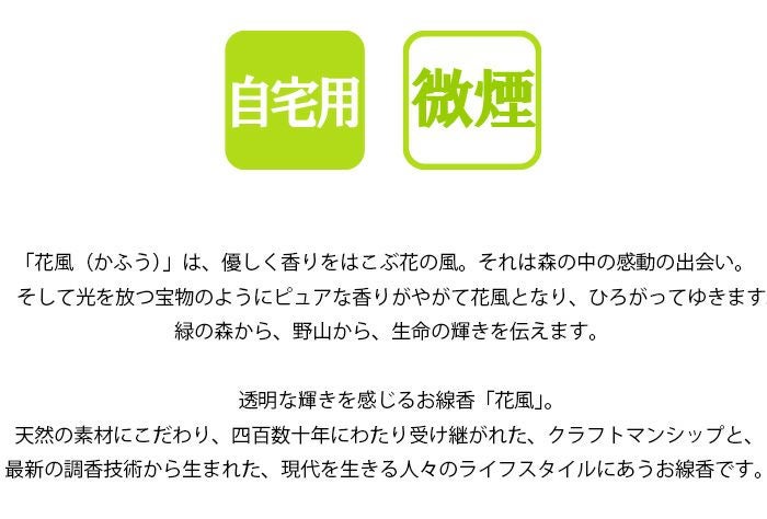 透明な輝きを感じるお線香「花風」。天然の素材にこだわり、四百数十年にわたり受け継がれた、クラフトマンシップと、最新の調香技術から生まれた、現代を生きる人々のライフスタイルにあうお線香です。