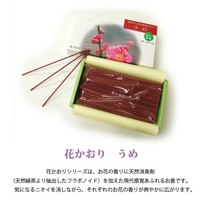 花かおりシリーズは、お花の香りに天然消臭剤(天然緑茶より抽出したフラボノイド)を加えた現代感覚あふれるお香です。
