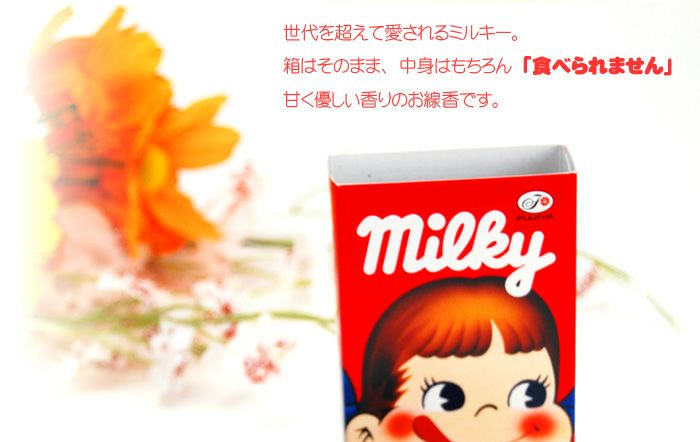 世代を超えて愛されるミルキー。箱はそのまま、中身はもちろん「食べられません」。甘く優しい香りのお線香です。