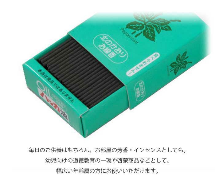 鼻にスッと抜ける爽やかなハッカの香りが心地良く、リラックスタイムにもぴったりなお線香です。