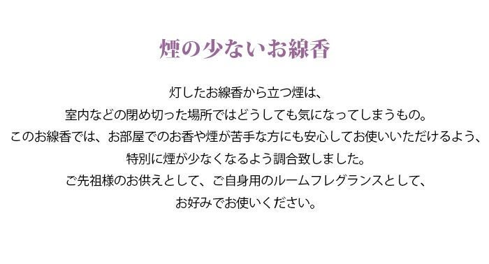 r> 煙の少ないお線香 灯したお線香から立つ煙は、室内などの閉め切った場所ではどうしても気になってしまうもの。このお線香では、お部屋でのお香や煙が苦手な方にも安心してお使いいただけるよう、特別に煙が少なくなるよう調合致しました。ご先祖様のお供えとして、ご自身用のルームフレグランスとして、お好みでお使いください。