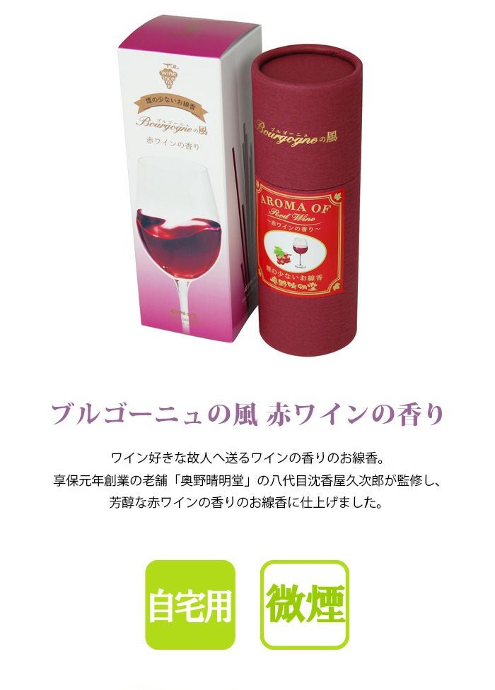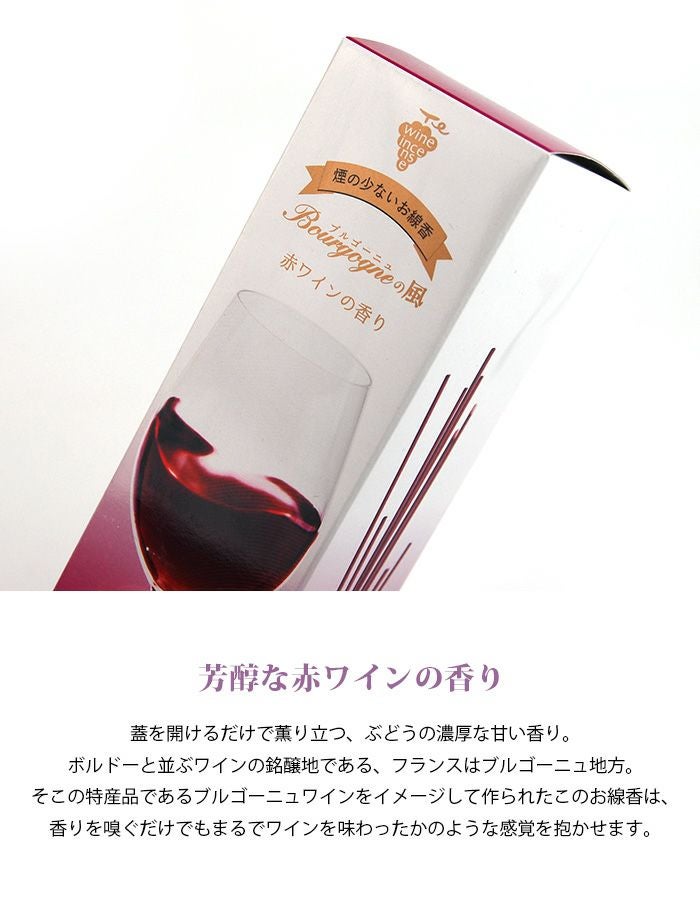 ボルドーと並ぶワインの銘醸地である、フランスはブルゴーニュ地方。そこの特産品であるブルゴーニュワインをイメージして作られたこのお線香は、香りを嗅ぐだけでもまるでワインを味わったかのような感覚を抱かせます。