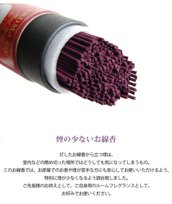 灯したお線香から立つ煙は、室内などの閉め切った場所ではどうしても気になってしまうもの。このお線香では、お部屋でのお香や煙が苦手な方にも安心してお使いいただけるよう、特別に煙が少なくなるよう調合致しました。ご先祖様のお供えとして、ご自身用のルームフレグランスとして、お好みでお使いください。