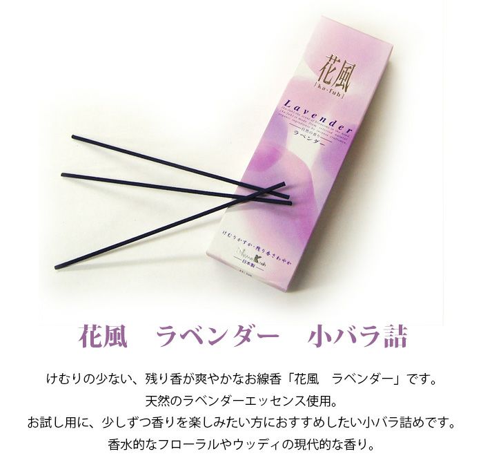 けむりの少ない、残り香が爽やかなお線香「花風ラベンダー」です。天然のラベンダーエッセンス使用。