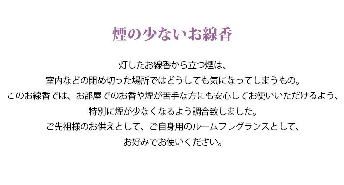 灯したお線香から立つ煙は、室内などの閉め切った場所ではどうしても気になってしまうもの。このお線香では、お部屋でのお香や煙が苦手な方にも安心してお使いいただけるよう、特別に煙が少なくなるよう調合致しました。ご先祖様のお供えとして、ご自身用のルームフレグランスとして、お好みでお使いください。