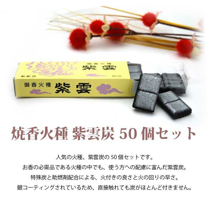 焼香炭がなくなりかけたので初めてネット注文させていただきました。紫雲はいつも使っていますので間違い有りません。よい炭です。発送も早く助かりました。