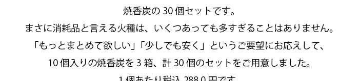 焼香炭の30個セットです。まさに消耗品と言える火種は、いくつあっても多すぎることはありません。「もっとまとめて欲しい」「少しでも安く」というご要望にお応えして、10個入りの焼香炭を3箱、計30個のセットをご用意しました。