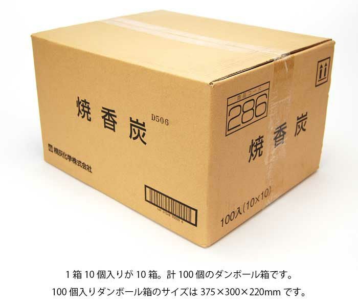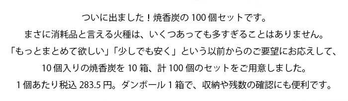 ついに出ました!焼香炭の100個セットです。まさに消耗品と言える火種は、いくつあっても多すぎることはありません。「もっとまとめて欲しい」「少しでも安く」という以前からのご要望にお応えして、10個入りの焼香炭を10箱、計100個のセットをご用意しました。ダンボール1箱で、収納や残数の確認にも便利です。